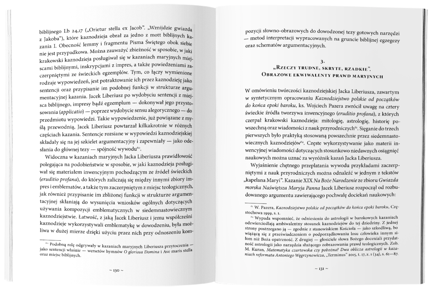 Próby kaznodziejów, by przybliżyć słuchaczom tematykę maryjną i skłonić ich do przestrzegania głoszonych zasad moralnych, widoczne są na różnych poziomach organizacji teoretycznej wypowiedzi. W związku z tym analiza odnosi się do metod dowodzenia (sfery inventio) stosowanych przez Jacka Liberiusza, w tym argumentacji biblijnej, struktury kazań (dispositio) oraz kształtowania się ich warstwy językowej (jelacutio). Ponadto rozważono zasadność uznania kazania maryjnego za odrębną odmianę (rodzaj kazania tematycznego), wskazując na jego cechy charakterystyczne. W pracy poruszono w szczególności kwestię sposobów obrazowania stosowanych przez Jacka Liberiusza, wynikających ze świadomości znaczenia zabiegów kaznodziejskich XVII wieku, mających na celu uwidocznienie podmiotu wypowiedzi (evidentia). Zbadano związki z symboliką obecną w tekstach oraz podjęto próbę zdefiniowania funkcji, jakie pełnią werbalne kompozycje figuralne w wywodzie kaznodziejskim.