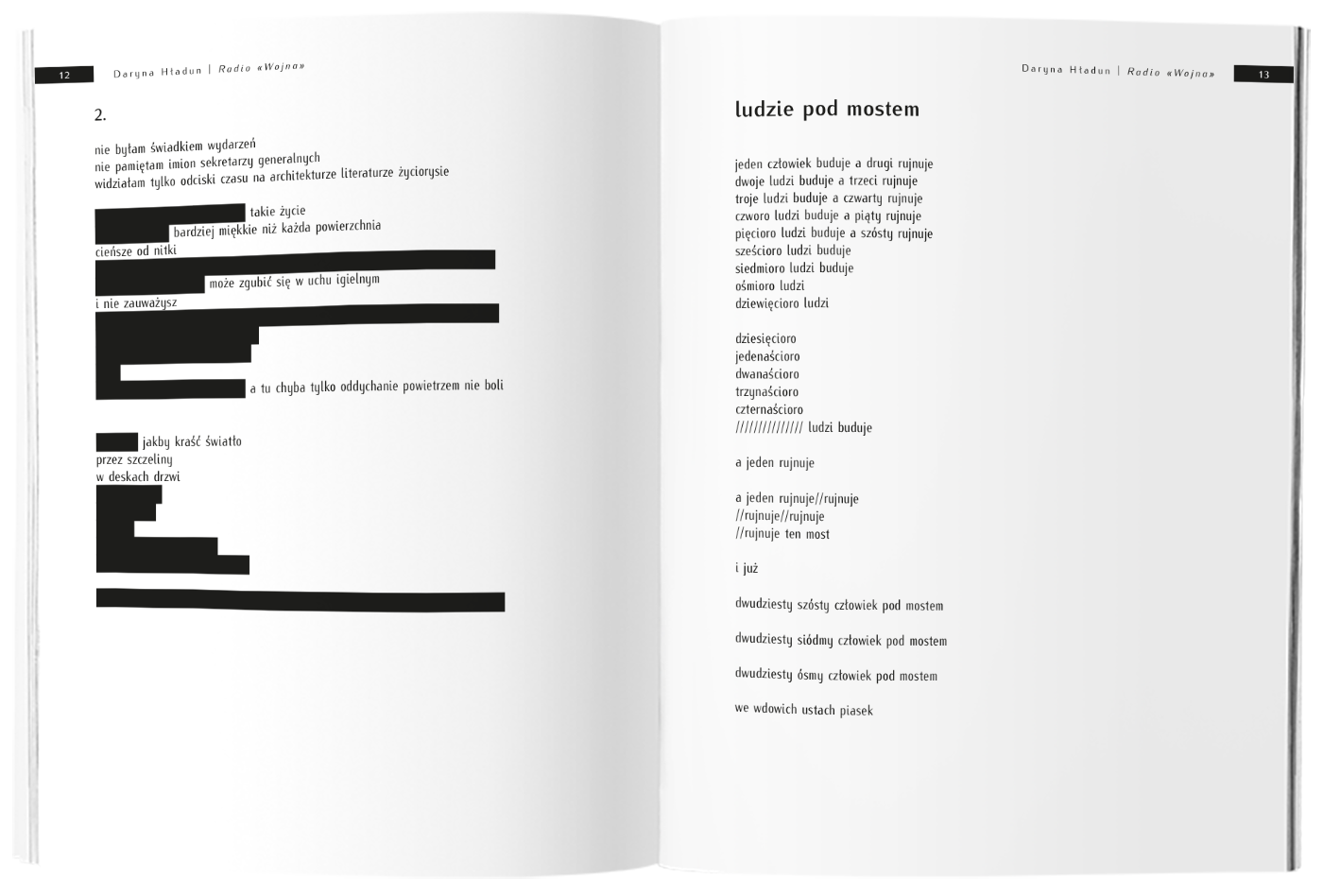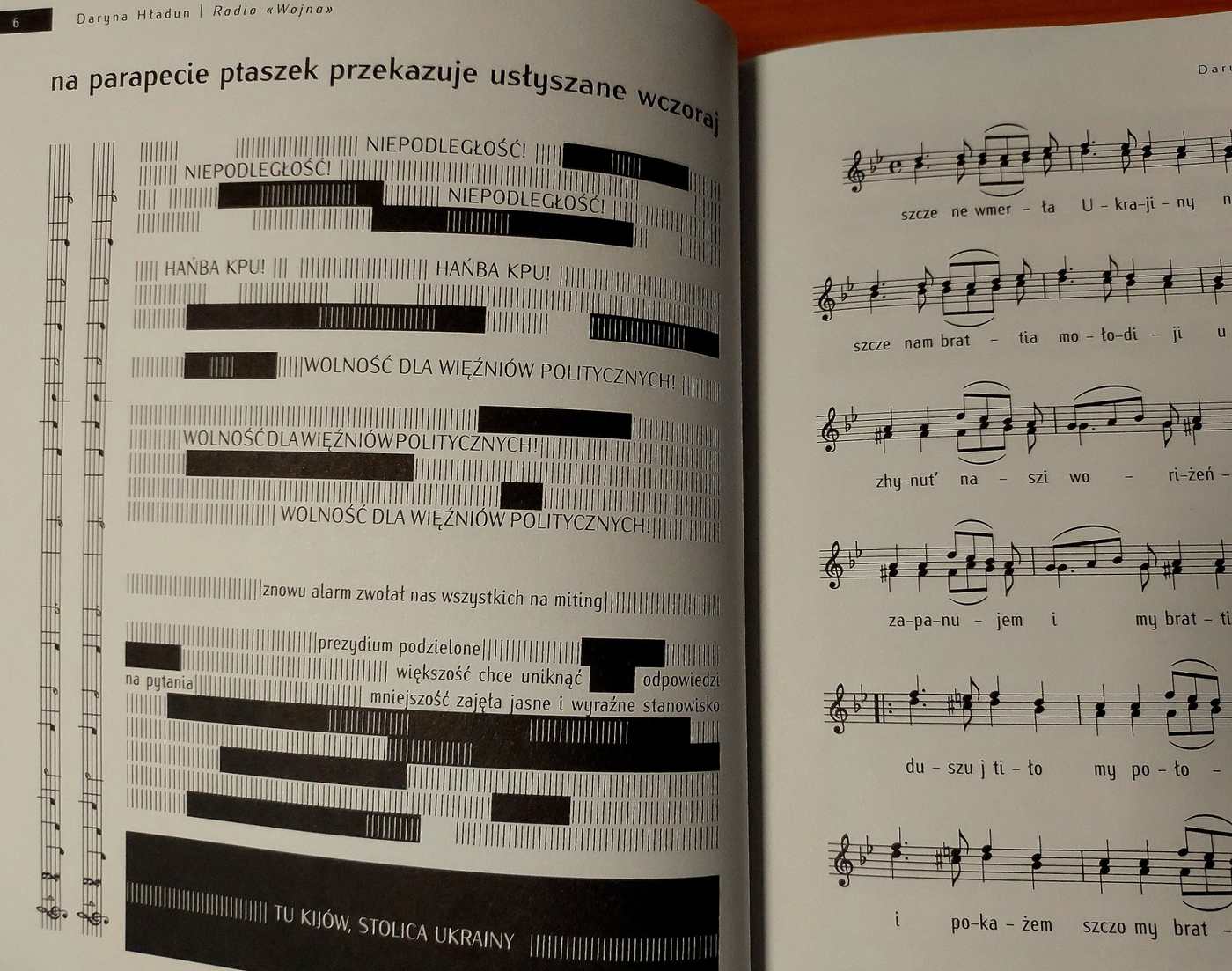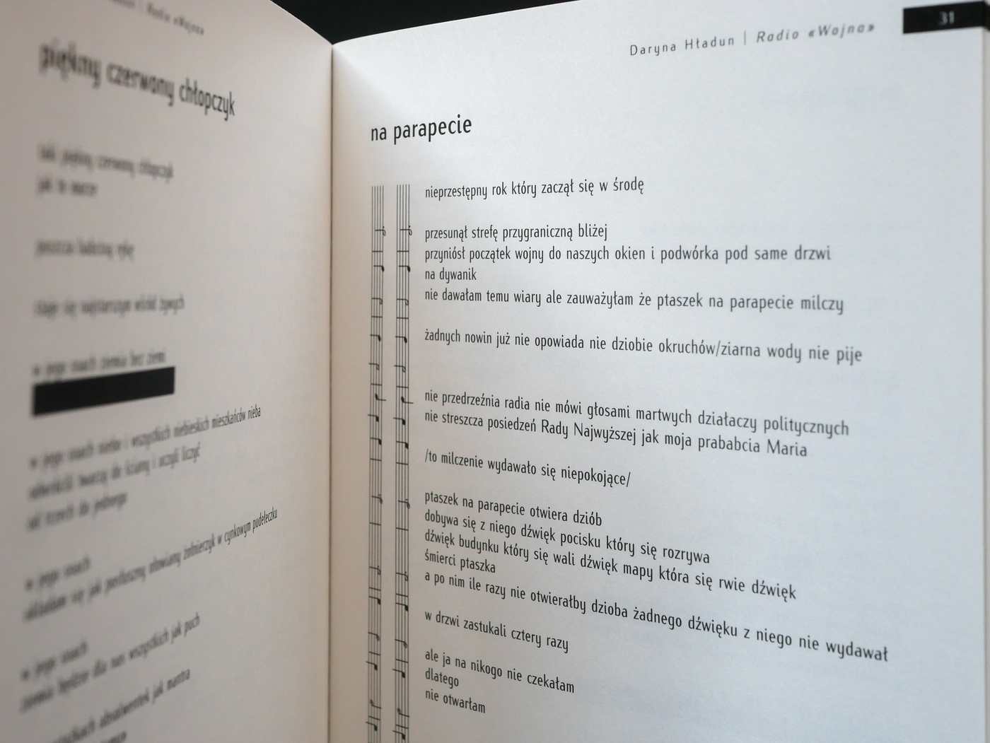 Poetka stała się głośnikiem nadającym na częstotliwości 24.2 FM – część wierszy powstała już po 24 lutego 2022 roku. Tego dnia wieczorem Daryna wyszła ze swojego domu z plecakiem. Skończyło się jej uporządkowane i przewidywalne życie. Za sobą miała odgłosy walk o hostomelskie lotnisko. Przed sobą noc. I drogę. A później rosyjscy żołnierze zamieszkali w domu, który zostawiła w kiedyś spokojnym i cichym mieście Bucza, którego nazwa jest teraz symbolem – jak Auschwitz czy Katyń.Źle, że „Radio «Wojna»” musiało powstać. Dobrze, że powstało. W chwili, w której Federacja Rosyjska usiłuje wmówić światu, że ukraińska historia i kultura nie istnieją, taki głos, jak głos Daryny Hładun, jest szczególnie potrzebny.
