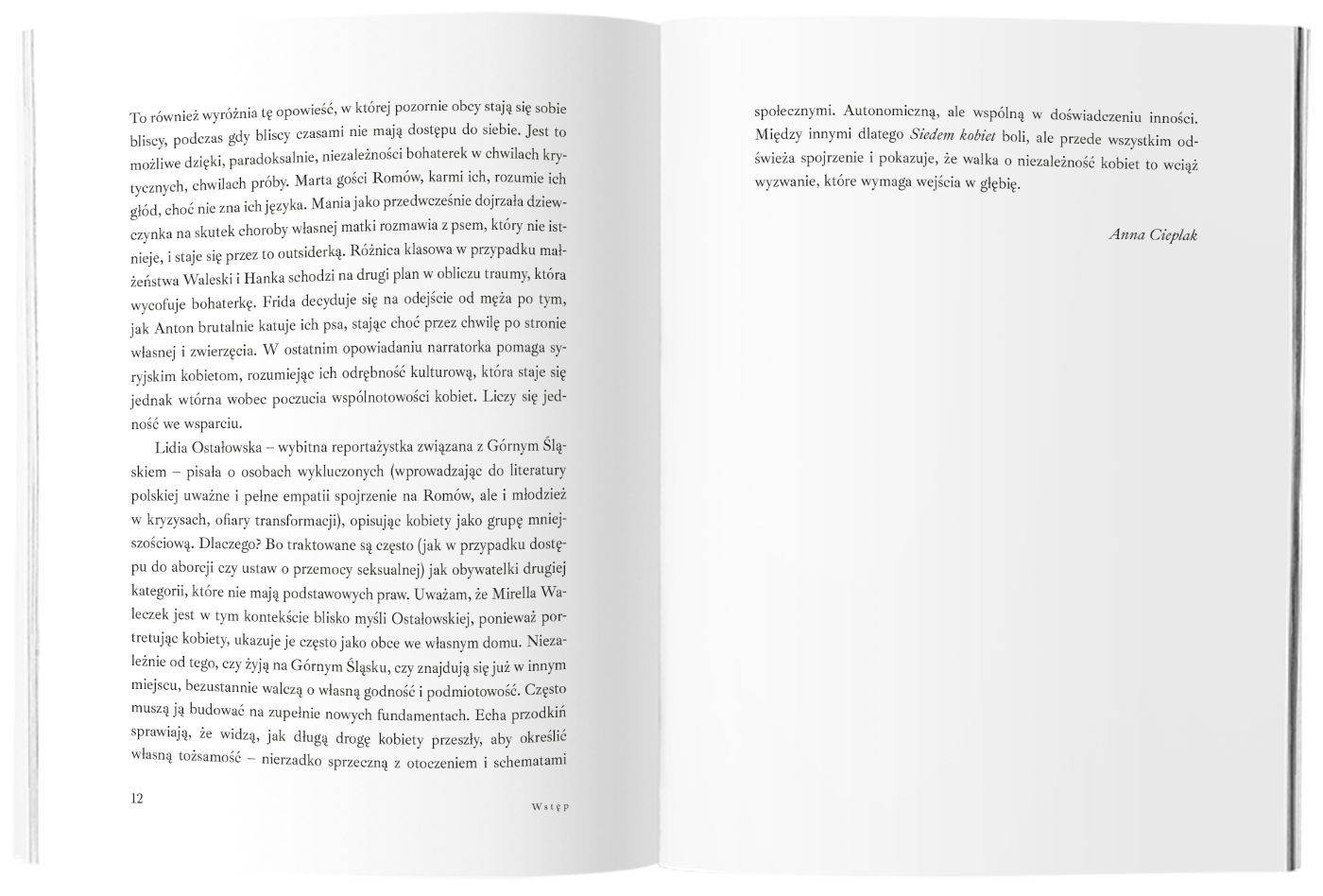Często brakuje mi w dyskusji o Górnym Śląsku miękkości. Ze świecą jej szukać wśród narracji o Śląsku separującym się, twardym, zalęknionym, że zostanie oskarżony o „dupowatość” czy słabość. Okazuje się, że aby zrozumieć siłę tej miękkości, wystarczyło jak Marta – bohaterka książki, którą trzymacie w dłoniach – opanować zdolność kierowania wzroku do wnętrza. Dzięki Mirelli Waleczek możemy to uczynić, mierząc się z prawdą o codziennych doświadczeniach Ślązaczek. Równocześnie nie tracimy z pola widzenia bogatego tła społecznego i historycznego, w którym przyszło żyć śląskim kobietom i mężczyznom na przestrzeni lat. Bo wbrew lub może właśnie dzięki herstorycznemu brzmieniu „Siedmiu kobiet” możemy dostrzec życie obyczajowe i polityczne kompleksowo, choć autorka sytuuje je jak najbliżej – w ciele konkretnych ludzi. W ich porowatości (czyli przepuszczalności, otwartości na innych), ale i w bliznach oraz głębokich ranach. (…) Autorka przeprowadza nas od czasów prababek-chłopek ciężko pracujących na roli aż do czasów migracji Ślązaczek do Niemiec, gdzie kobiety szukają swojej tożsamości w nowej sieci relacji i doświadczeń – nie tylko tych stąd. Wszystko to dzieje się w nieprzypadkowym splocie i dramaturgii, dzięki której „Siedem kobiet” to również intymna historia, którą można traktować jako szansę na zbiorową psychoterapię dla Górnego Śląska, ale i lekturę pozwalającą wrócić do uniwersalnych pytań o to, co oznacza feminizm oddolny i organiczny.Anna Cieplak (ze Wstępu)